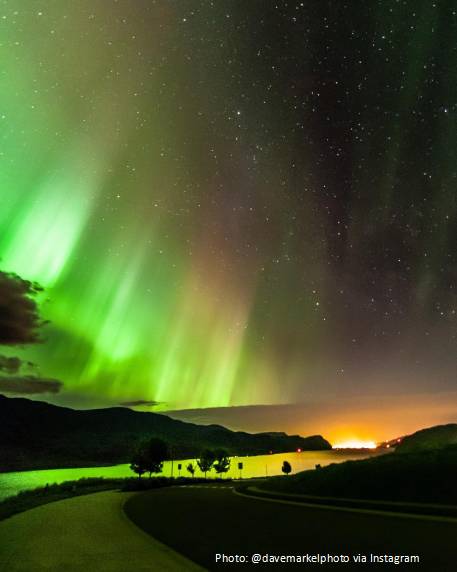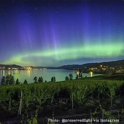 欧垦娜根山谷(Okanagan Valley)中的欧垦娜根湖(Okanagan Lake)也是巧遇极光的妙处。澈绿的荧光如纱般浮在天穹里,暗淡的水波点缀上缕缕幽光,散发出动人的色彩。欧垦娜根湖的东岸是盛产葡萄美酒的那纳拉马塔阶地(Naramata Bench),在极光星夜中品呷佳酿,缘来醉意渐浓。