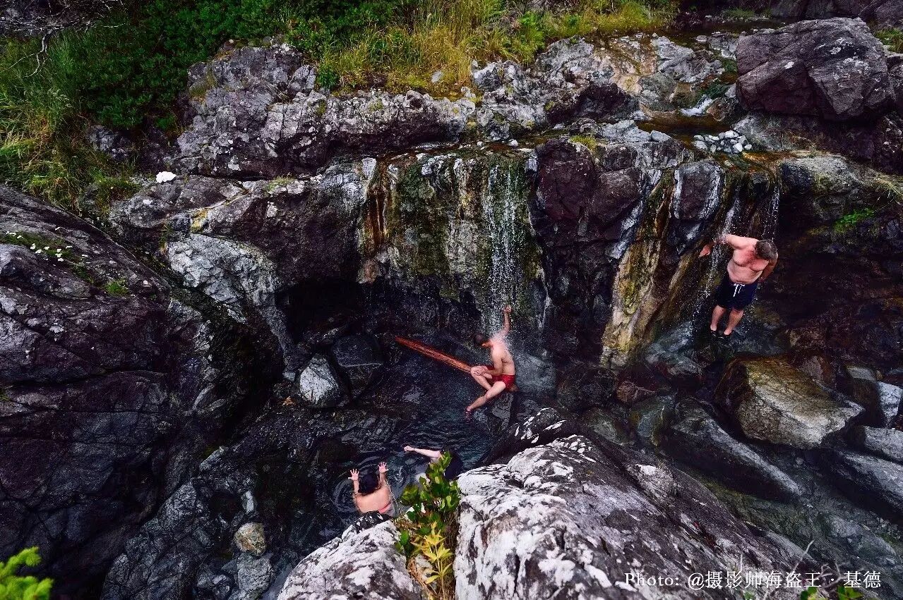 徒步40分钟后,一股炽热的硫磺味随着空气弥荡在林间,走近才发现源头是这条热气腾腾从山坡的石缝中涌出的山间溪流,这里也正是徒步的终点—温泉湾。一连串的温泉小涧,完全纯天然而成,没有任何人工痕迹。在临近海边的温泉池处,一条温泉瀑布从礁石上挂落而下,一边淋着温泉瀑布,一边不时有太平洋冰冷的浪翻涌到脚边,真是人间享受的极致体验。