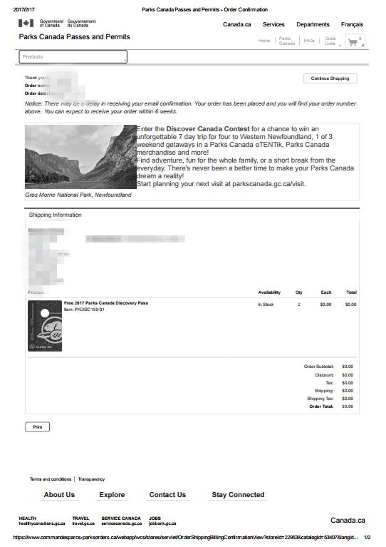 2017年国家公园免费啦! 2017年已经过去快两个月了,相信大家已经感受到加拿大的崭新的面貌。屡次被Lonely Planet Best in Travel、国家地理杂志等权威机构屡次推荐,以及150周年纪念这样的大事,都使得这个国家在2017年格外引人注目,在这么多大事中,大家最关注的一定还是为了庆祝150周年,国家公园、国家历史遗址和国家海洋保护区门票免费这件事,那么今天小编就来说说国家公园免费门票Discovery Pass如何预定领取吧! 「加拿大国家公园门票免费Discovery Pass」 图片来自:http://www.commandesparcs-parksorders.ca/ 2017年加拿大的国家公园免费实行的是“免费不免票”的政策,也就是说你需要持票进入加拿大的国家公园、国家历史遗址和国家海洋保护区,那么如何获得免费的门票呢? 有两种方式可以获取: 官网预定 登录2017 Discovery Pass官网,选择你需要的免费门票张数,放进购物车,点击进入购物车,不用填写Promotional Code,直接点击Continue Checkout就会出现地址一览。 ▼ ▼ 地址一栏分为账单地址(Billing Address)和邮寄地址(Shipping Address)。因为国家公园门票是免费的,所以只填写第一栏就好,在第二栏的标题下面有一行小字“Same as my billing address”,勾选这一栏,就不用再填写一遍了。 ▼ 提交信息点击下一步(next),确认你的收件信息是正确的点击下单(order),这样加拿大国家公园免费门票就申请完毕了。 确认提交订单之后,你会收到一封来自加拿大国家公园发送的邮件,邮件是你申请国家公园之后的订单编号,这封邮件证明你已经申请成功,坐等收卡就好。 ▼ 班夫娘收到的国家公园免费门票 图片来自:加拿大班夫国家公园官网微博 小编提醒大家,国内的同学们也是可以申请的,填写国内地址就行(英文或者拼音填写),只不过收到卡的时间会比较慢,大概一个月左右,当然也有时间更长的,像班夫娘就等了两个多月... 预定网址: http://www.commandesparcs-parksorders.ca/webapp/wcs/stores/servlet/en/ProductDisplay?storeId=22953&categoryId=216870&catalogId=53407&productId=524527&errorViewName=ProductDisplayErrorView&top_category=216870&parent_category_rn=216870&langId=-1 等不及邮寄怎么办 在国内的同学说两个月的邮寄时间太长,等不及,那么可以将刚才填写的申请表打印出来,这样带着打印件可以在国家公园的游客中心(Visitor Center)领取免费门票。 ▼ 或者有同学申请了卡但是忘带了,这种情况不要担心,可以直接在加拿大的任何一个国家公园游客中心重新申请一张。 一些小问题说明 1. 国家公园的免费门票不需要每个人都持有,一家人有一张就可以。 2. 除了公园门票和上面说的两个遗址门票免费外,其他服务都是需要交费才可以的,包括露营、钓鱼许可、明火许可、温泉、缆车这些服务等等还是需要费用的。 3. 所有2016年的年卡有效期都有24个月,基本就是在你买的日期后顺延一年,比如如果你在2016年5月购买了2016年的年卡,这个年卡的有效期将会延长到2018年5月,而且你也不需要申请专门的Discovery Pass,只要继续使用你2016年的年卡就好啦! 申请完国家公园免费门票之后,我们一起去看看加拿大的国家公园有多美吧!除了之前大家耳熟能详的国家公园外,这次,小编特地选出了一些可能不是那么有名但是仍然独居特色的国家公园,趁着免费,大家可以来看看哦! 福里隆国家公园 Forillon National Park 坐标:魁北克(Quebec) Photo Credit:Andrea Schaffer via Flickr 福里隆国家公园(Forillon National Park)是魁北克省的第一个国家公园,也是魁北克省内汽车可以到达的风景最美的地方。公园位于魁北克省加斯佩半岛(Gaspe Pen.)上,“Gaspe”意为“陆地的尽头”,这里有的,就是海角天涯的沧桑心境。 Photo Credit:Andrea Schaffer via Flickr 种类繁多的海鸟是福里隆国家公园最大的看点之一。海鸟繁殖时期,能看到面向大海的悬崖上栖息着密密麻麻的海鸟。在近海处,还时常可以看到鲸鱼和海豹出没,6月至10月份,是乘坐游轮出海欣赏鲸鱼在海中嬉戏玩耍,跟水中的大家伙们亲密接触的好时节。 Photo Credit:Andrea Schaffer via Flickr 官网: http://www.pc.gc.ca/eng/pn-np/qc/forillon/index.aspx 麋鹿岛国家公园 Elk Island National Park 坐标:艾伯塔省(Alberta) Photo Credit:Grempz via Flickr 麋鹿岛国家公园(Elk Island National Park),位于艾伯塔省首府埃德蒙顿以东35公里。公园成立于1913年,总面积194平方公里。这里是加拿大覆盖面积最大的国家公园。 Photo Credit:Jeff Wallace via Flickr 该公园是世界上第一个野生动物保护区,也是世界上最大的有蹄类动物的栖息地。你能在这里找到包括野牛、麋鹿、驼鹿、土狼、和海狸等野生动物。你还可以在这里找到超过250种鸟类,最值得一提的是红颈水鸟(red-necked grebes)、 双冠鸬鹚(double-crested cormorants),它们都是北美地区本地的鸟类,而且在麋鹿岛国家公园也是出镜率最高的。 Photo Credit:ceasol via Flickr 在麋鹿岛国家公园,你还会经常遇到交通拥堵,而野牛恰巧就是造成堵车的“罪魁祸首”。 官网: http://www.pc.gc.ca/eng/pn-np/ab/elkisland/index.aspx 优鹤国家公园 Yoho National Park 坐标:BC省 Emerald Lake Photo Credit:Albert de Bruijn via Flickr 拔地而起的山墙,亿万年堆积的冰川,翡翠般的湖水,气势奔腾的瀑布,这边是位于BC省的优鹤国家公园 (Yoho National Park),正如“YOHO”在加拿大克里语中的意思“敬畏的感叹”一般,她带给人们的就是这种感觉。 Emerald Lake Photo Credit:[bastian.] via Flickr 公园中翡翠般温润通透翡翠湖(Emerald Lake),有“万物神往