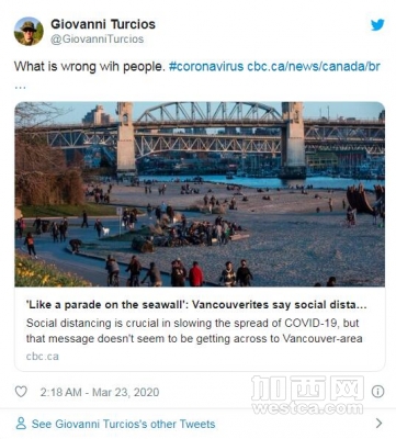 温哥华公园局最近关闭了公园内的公共设施,从沙滩上移走了原木,以防止人们坐在一起,虽然暂时还没有关闭公园,但表示如果人群继续聚集在这些地方,无法保持足够的距离的话,将考虑关闭这些公园。