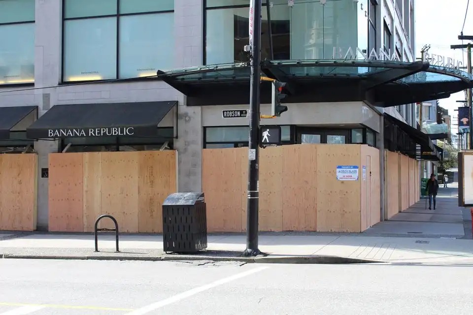 平常繁华喧闹的温哥华市中心呈现出一片荒凉景象。 然而,有不法之徒惦记着这些店铺里的物品,入店抢劫案多发,逼得很多零售商家不得不开始给门外装上木板 坦白说,安装这些木板可比换一块商店橱窗的玻璃便宜多了,外加上损失掉的店内物品,让商家们纷纷开始响应。 唯一不变的景象,似乎就是那些露宿街头的流浪汉,继续踏实的睡在街边。不知道疫情过后,是不是会有更多人将露宿街头…… URBANYVR网站拍摄了3月29日,周日的温哥华市中心街景