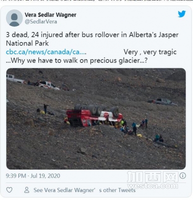 (加西网综合)阿尔伯塔省的哥伦比亚冰原(Columbia Icefield),是游客们最喜爱的景点,周六发生观光巴士翻车的严重车祸,导致3人死亡24人严重受伤。