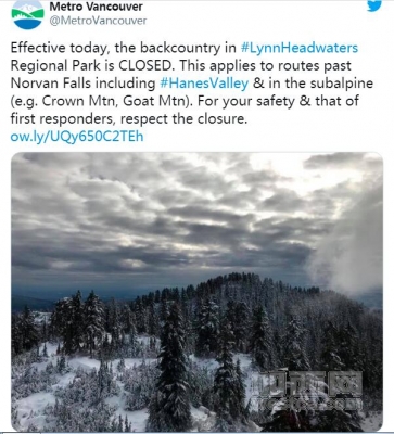 大温都市局(Metro Vancouver)在周日(10月25日)发布这一消息,并补充说,由于天气情况恶劣以及不安全的冰冻,登山路径已暂时关闭,并且在周一持续生效。