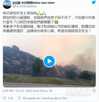 有华人网友说:尔湾大火,朋友要紧急撤离。。老美今年是不是被下了降头,也太多事之秋了。。。