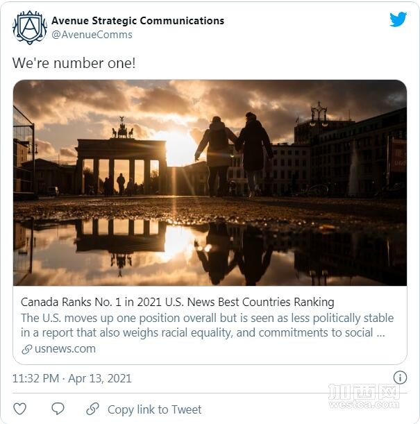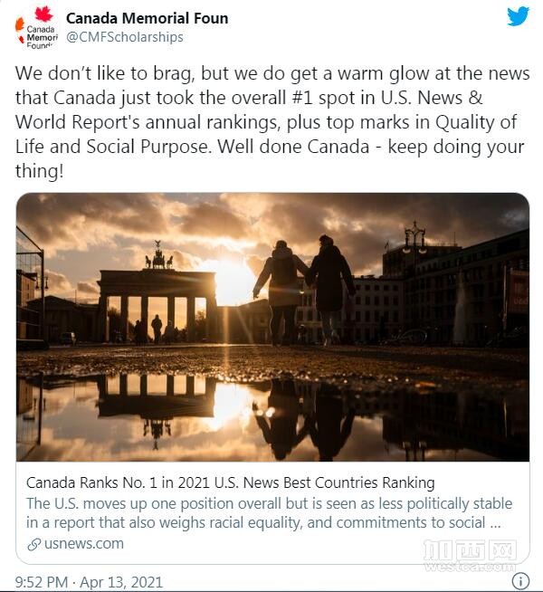 说完护照实力,还有一项更逆天的排名,那就是2021年全球最佳国家报告,加拿大首次名列第一!