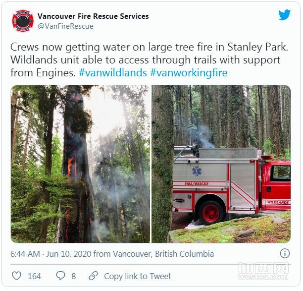 (加西网综合)昨天,史丹利公园林区一棵枯树莫名着火,幸好有溜狗人士及时发现,避免发生一场大火。温哥华消防人员正对事件进行调查。