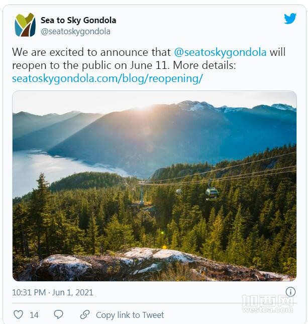 在BC省宣布分阶段放宽限制后,曾2次被恶意割断缆车电缆后,海天缆车(Sea to Sky Gondola)于周二(6月1日)宣布将于6月11日下周五重新开放。