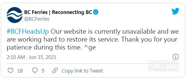 BC渡轮(BC Ferries)在社交媒体发布推文表示,“目前网站无法使用,正在努力恢复服务中。感谢您在此期间的耐心等待。”