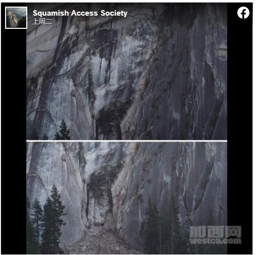 (加西网综合)加拿大攀岩胜地斯阔米什(Squamish)酋长山(Stawamus Chief Provincial Park)由于发生大石板断裂,山上的许多攀岩路线暂时关闭。