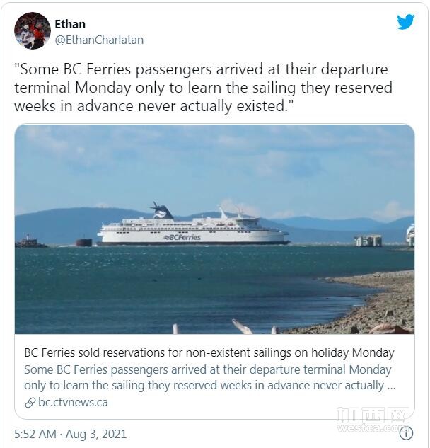(加西网综合)据CTV News报道,BC渡轮(BC Ferries) 出现超级失误,网上预售长周末周一(8月2日)的船次,竟然不存在!