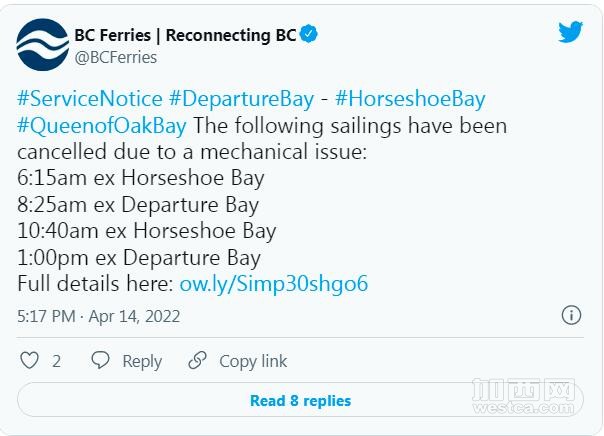 今天周四有7个渡轮由于机械故障被迫取消,其中Horseshoe Bay 和 Nanaimo 之间的航班受影响最大,主要因为橡树湾皇后号的舵机出现机械问题,这艘船可以运输 300 多辆汽车和近 1,500 名乘客和船员。