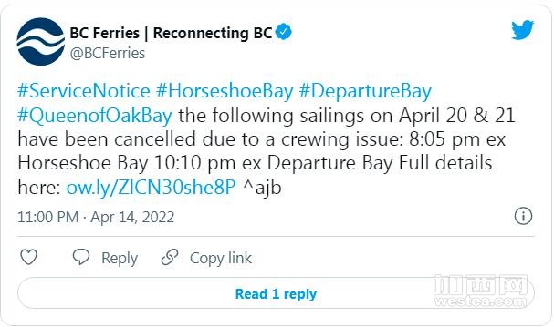 BC渡轮表示,受影响渡轮的预订费和已支付的票价将全额退还,并敦促乘客使用 Tsawwassen 到 Swartz Bay 的路线和 Tsawwassen 到 Duke Point 的渡轮作为替代选择。
