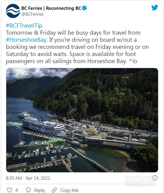 同时,BC渡轮还鼓励旅客考虑在长周末高峰时段以步行乘客的身份出行。