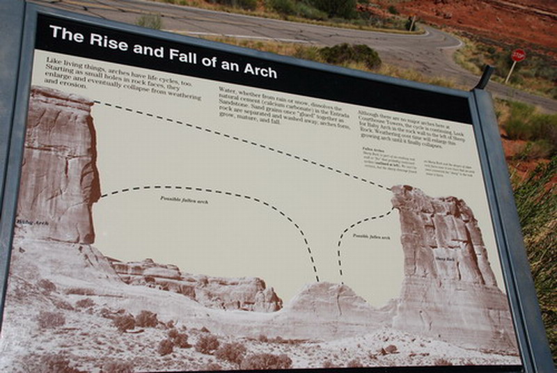 拱门公园还有另一个著名的拱门,LANDSCAPE ARCH,堪称跨度之最,要观赏他还是要付出些汗水。TRAIL还算平坦,但无遮无挡,在半个小时后来到它底下。它和其它拱门不同,可以说是最纤细苗条的一座,像一道彩虹飞跃在空中,中间一段看上去非常细,随时都会断裂。稍有极端气候,后来者可能就看不到它了。公园里有张图片就介绍了一个消失的拱门。我们现在看到的sheep rock以前是拱门的一部分。