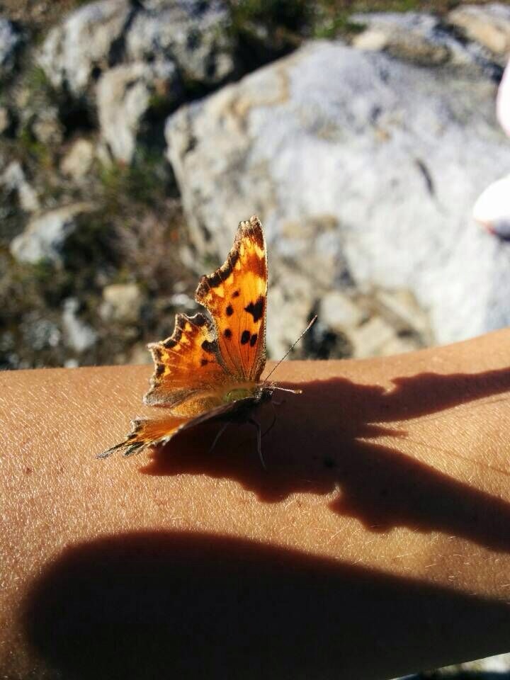 蝴蝶飞累了吗?不在意停在人的手上。冬天快来了,找个地方冬眠吧!