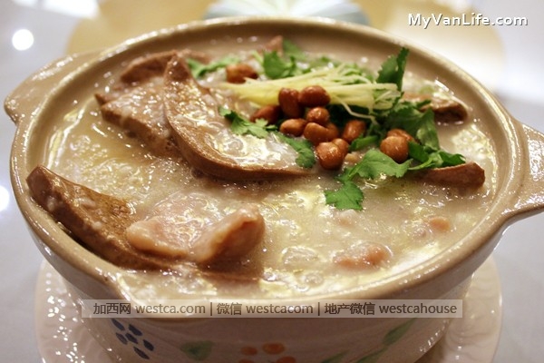 若要挑令人教失望的菜肴,大改就是那道八宝鸭了。卖相堪称完美,但切开分食後,鸭肉过於松软,和莲子、火腿、虾仁、栗子等内馅一同入口,反倒吃不出鸭肉应有的香气和口感。 餐厅里的小食也包含了港式的面点。一样叫做油条,台式油条炸得外层酥脆,中间空荡荡,带有即香的油酥味。港式油条较为紮实,扳开後有如面包般地内里。餐厅端上咸甜两味油条:外型浑圆的咸煎饼,内馅包裹些微的红豆腐乳,和油炸後的面包般的油条还挺速配,新鲜又爽口。 牛俐酥则是甜的油条,除了长相是长 椭圆形,其色泽和味道与台湾街头摊贩贩售的“双胞胎”有90%的相似度。猪润肉片粥其实就是猪肝粥。猪肝慷慨地在稀饭里载浮载陈,不致过老僵硬,软度刚好 却也不带血。稀饭可以嚐出是熬煮多时典型港式粥品,感觉上刻上一大锅後开口就是流利的广东话。 既然叫做粥品店,粥当然是老板和主厨的用心之处。不论粥品或是油条都是现点现做,如果你有兴趣,不妨站在透明玻璃窗向开放式厨房瞧瞧。 早餐和中餐粥品的选择也是别出心裁。如果看倌吃过温哥华热门的鱼汤面,就稍能了解此餐馆粥品的创意之处。 早餐是粥品套餐,油条、肠粉任君挑选。午餐号称“百搭粥”,稀饭有“白粥底”、“有味粥底”以及“胡椒粥底”三种可以选择。自行搭配想吃的配料,再选一种配料,组合出自己想吃的粥品,绝对不会和他人“撞粥”。 可以清粥小菜,也可以生猛海鲜,这家餐厅真是包山又包海。虽然开幕不到一个月,餐厅的位址也不是在最热闹精华地区短,简洁但有中国风味的餐厅里晚餐时段几乎满座,可见菜式颇得顾客欢心。 ㄒ温哥华人真是好福气,各种餐饮选择琳琅满目,而且还持续增加中。百搭粥踩中我崇尚“小清新饮食”的弱点,一直有想去一亲芳泽的冲动。 这个周末,就来个Congee Brunch吧!