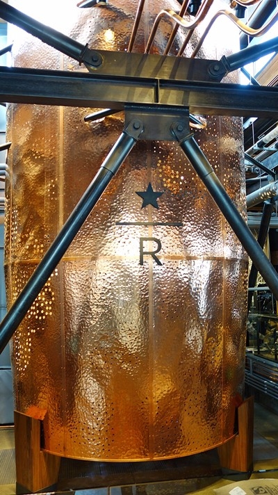 在这里你只会看到三种建材:洗白磨石子一路延伸铺满全室;原木系列的天花板、吧台、桌面座椅;红铜色巨大的排气管、一根根咖啡豆运送管路在半天高的 空间横窜。没错,星巴克把整个咖啡烘焙工厂搬进了咖啡馆内 — 身着吊带工作服的粗旷工人将咖啡豆从麻布袋内倾倒而出,一旁在巨大的搅拌池边同事专注地操控机器,监视着烘焙的过程。顾客们或手持咖啡杯或一张地图,站在 围栏前聆听工作人员的解说。