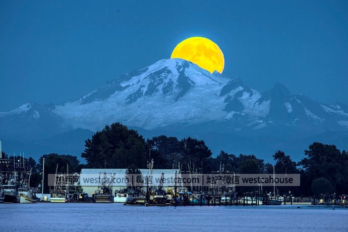 温哥华的8月31日,也是8月的第二个满月,所以第二个满月也称 为“蓝月亮”,其实这天的月亮和蓝颜色是没有一点关系的。晚上不到八点扛着相机就赶到了列治文的渔人码头,准备以100多公里以外的美国贝克雪山为背景拍 摄“蓝月亮”,本来并不知晓月亮会从雪山何处升起,一直等到九点零二分五十四秒时才突然发现月亮是从贝克雪山的山顶上满满升起来的,等到月亮完全出现用时 三分零三秒,景色令人震撼! 相机为尼康D4S,镜头尼克尔600毫米,反光板预升,快门线拍摄。