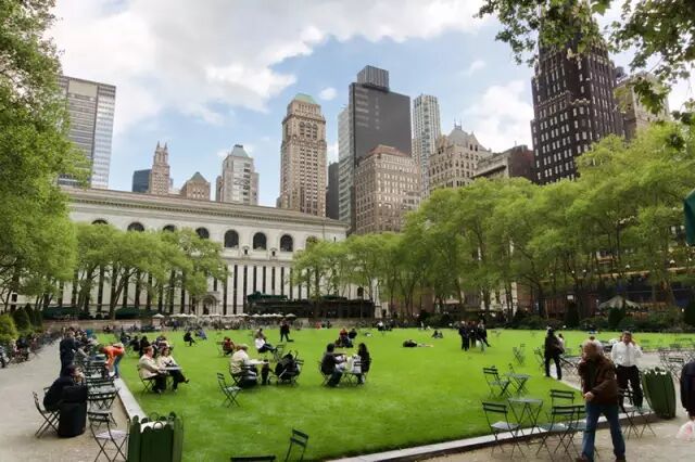 我最喜欢的公园,也不是中央公园,而是42街上的布莱恩公园(Bryant Park),离时代广场只有两个街区,就在纽约市立图书馆的旁边。说是公园,但其实就是一片大草地而已,也没有围墙,在路上走累了走两三步就能走进去。但它其实又不仅仅是大草地,还有很多的功能。平时公园上放着几百把绿色的椅子,中午的时候附近写字楼里的上班族会拎着外卖或便当盒跑到公园里边晒太阳边吃饭。