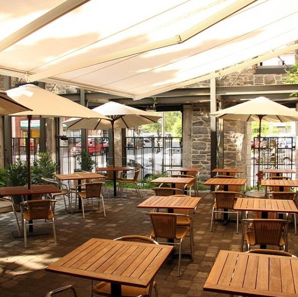 Boris Bistro也是蒙特利尔最大的户外庭院餐吧,每年夏季从早11点开至晚11点。慵懒的午后时分坐在高大树下的天然树荫中,白色的遮阳伞、淡色原木的桌椅和灰色石质的台阶映衬着绿叶,带来清凉和宁静的感受。夏日傍晚,不妨和朋友们在这里小坐,喝一杯草莓清酒可尔必思,再从菜单上挑选几例法国家庭风格的新鲜小菜一起分享。